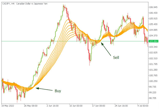 Ketika semua Moving Average menyatu menjadi satu titik pada grafik, kekuatan tren mungkin melemah dan mengarah ke pembalikan. Kebalikannya adalah benar jika Moving Average membentuk pola seperti bentuk kipas (masing-masing bergerak melebar atau menjauh), menunjukkan bahwa kisaran harga dan bahwa tren sedang kuat atau menguat.